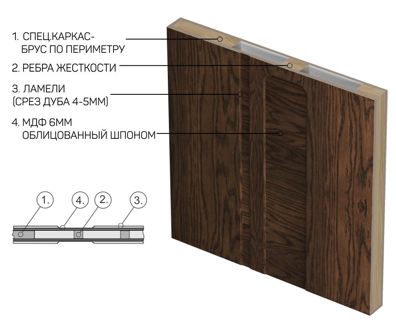 В основе силовой обвязки любой двери компания Терем использует инженерный cэндвич-брус собственного производства. Он состоит из нескольких слоев высокоплотной плиты МДФ и многослойной березовой фанеры.Наши конкуренты по-прежнему применяют сосновый брусок в обвязке - коэффициент его температурного расширения отличается от коэффициента МДВ панели, которой облицовано полотно, другими словами, когда в доме влажно, брусок растёт быстрее лицевой панели, и наоборот. Это неизбежно приводит к дефекту «провала кромки».