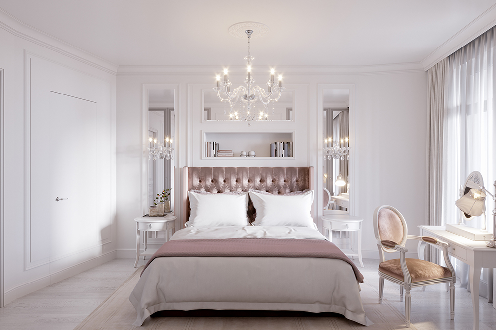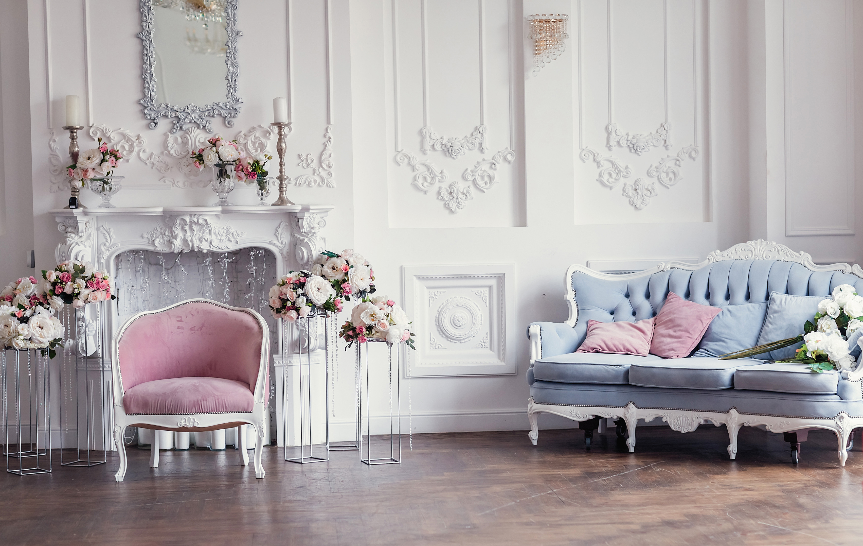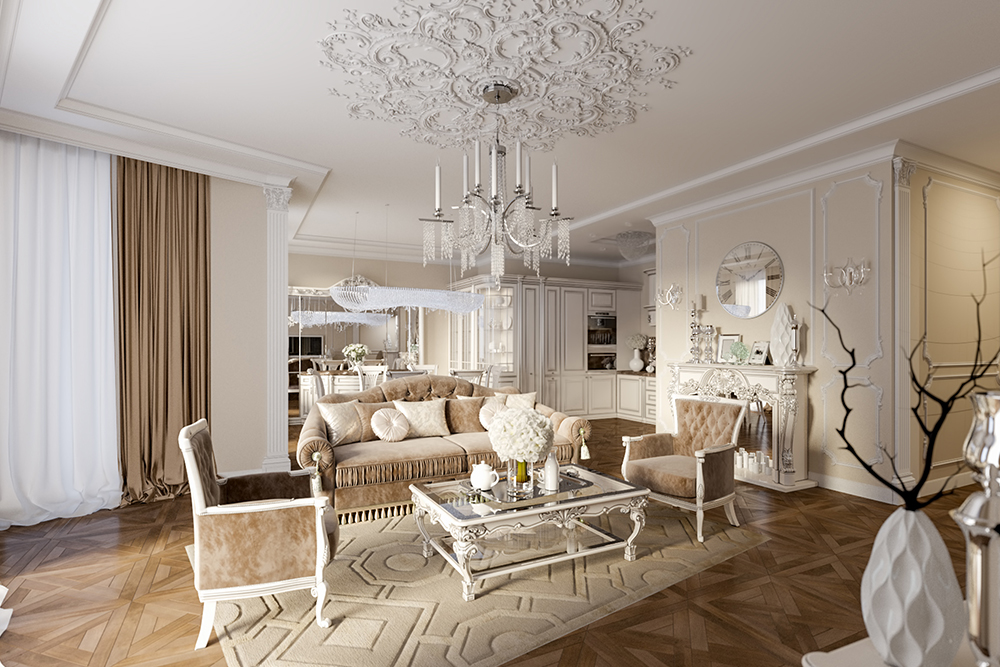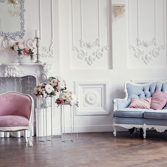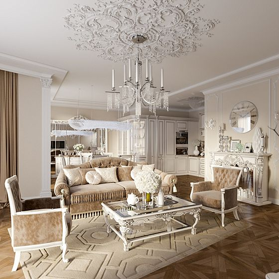 Дизайном интерьера, конечно, занимается женщина. Она в курсе последних трендов и рекомендаций известных дизайнеров, а еще интуитивно опирается на собственное чувство стиля и видение красоты. Все сделано лучшими мастерами только из ценных материалов и чаще всего по индивидуальному заказу. Гостиную обязательно украшает дорогая люстра из последней коллекции и изящная мягкая мебель. Сделать комнаты более радушными и естественными помогают живые цветы в вазах и изысканный декор: классические картины, семейные фото в рамках, фарфоровая посуда, текстиль с изящными узорами. Планировка должна быть открытая, а потолки высокими, чтобы помещения наполнялись светом и воздухом. На полу — паркет, который органично сочетается с плинтусом и дверными проемами. Двери в классическом стиле, но с модным, утонченным и изысканным дизайном. Конечно, в эмали. Цвет - белый, молочный или другие пастельные тона.