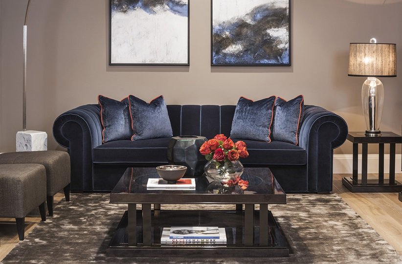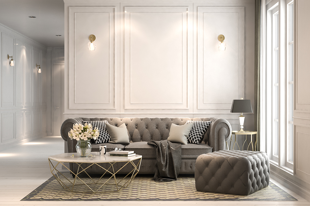 Мебель в современном классическом дизайне интерьера должна быть гармонично уравновешена: строгие линии сочетаются с плавными изгибами. Никакой чрезмерной пышности и громоздкости. Обивку лучше выбирать без сложных орнаментов, не слишком яркого цвета, но из дорогостоящего благородного материала. В дизайне присутствует весь полноценный комплект мягкой мебели, который включает диваны и кресла. Вполне уместными будут английские кресла «с ушами» и современные варианты диванов честерфилд. Помимо этого в разных комнатах размещаются стулья с овальными мягкими спинками и сидениями, необычные журнальные столики, комоды, консоли и секретеры, столы, украшенные узором по дереву, шкафы-витрины с витражами или стеклянными дверцами, банкетки, капитоне, кушетки, канапе.