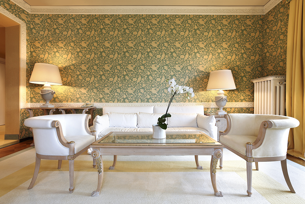 Одно из заметных изменений в оформлении современного классического интерьера по сравнению с традиционной классикой: одновременное применение природных и искусственных материалов. Помещение может быть задекорировано гранитом, мрамором или дорогостоящим деревом, но с таким же успехом можно выбирать качественный пластик, плиты, имитирующие древесную структуру, а также композитные панели. Для оформления стен преимущественно используется декоративная штукатурка или обои со сдержанным рисунком. Необычный, но очень выразительный способ отделки: имитация буазери с помощью молдингов или деревянные стеновые панели. Для выразительности интерьера также можно использовать лепнину, но она должна быть не пышной, а строгой. Лучше всего для дизайна использовать простые карнизы, молдинги и фризы с лаконичным оформлением. Такие приемы декора обеспечивают симметричность обстановке, а также визуально делают высоту комнаты больше.