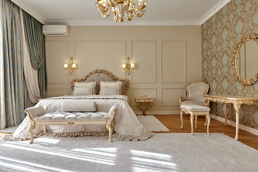 Арт-деко — это роскошь и богемность, любовь к новинкам прогресса и претенциозность. Основными требованиями к оформлению интерьера считается: наличие геометрических узоров, многоуровневых потолков, глянцевой мебели, элементов дорогостоящих материалов (натуральные шкуры и кожа, дерево, стекло, мрамор) и тканей (шелк, атлас, велюр). Также к особенностям стиля можно отнести большое количество света, применение ярких красок и зеркала в виде солнца. В качестве покрытия для стен используются обои с крупным геометрическим орнаментом или краска насыщенного цвета. Пол может быть задекорирован различными материалами: паркетной доской, ламинатом или керамической плиткой. Потолок делают темным с большим количеством софитов, что обеспечивает комнате нереальную клубную атмосферу, или же выбирают белый цвет и дополняют светлый потолок золотыми бордюрами. Хорошо, если в обстановке будут присутствовать алюминиевые и хромированные элементы, нержавеющая сталь. Особого лоска арт-деко придают полировка, глянец и лакированные предметы. Создать особую атмосферу также помогают винтажные постеры, дорогостоящие безделушки из разных стран мира, статуэтки в стиле ретро, картины авангардистов. Для цветовой гаммы арт-деко характерен выбор трех и более основных цветов. Среди них могут быть оттенки коричневого, серого, кремового, металла. Яркие краски используются только в виде акцентов, например, красный, бордовый, золотой или зеленый.