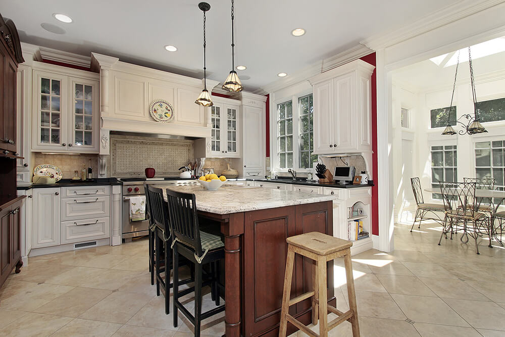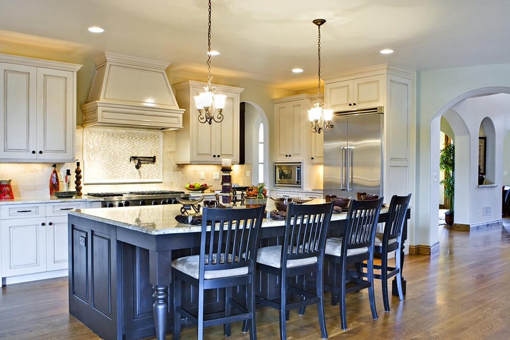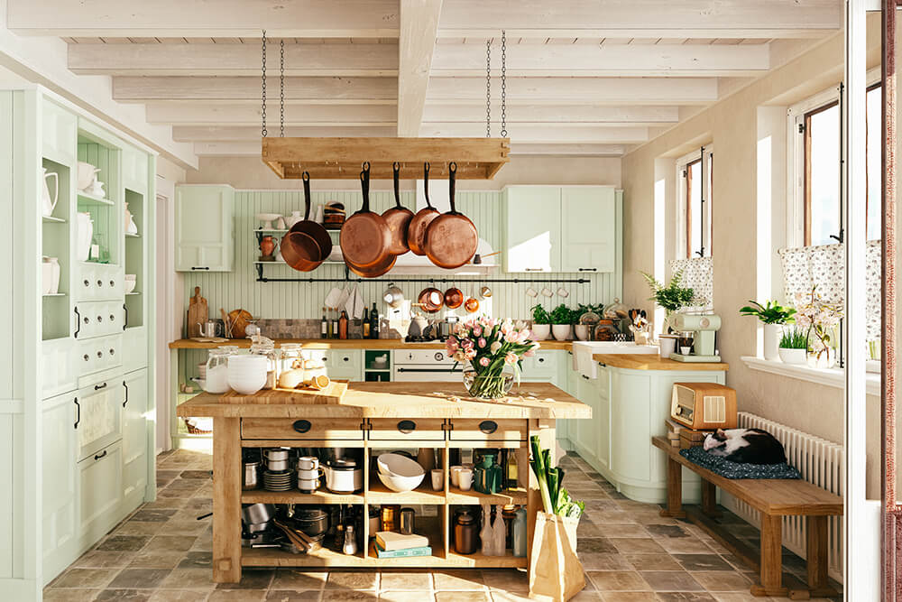 Потолки в комнатах с французским стилем обязательно украшаются деревянными балками или их качественной имитацией. На кухне к ним можно подвешивать сухоцветы, тканевые мешочки с пряными травами или даже кухонную утварь. Чтобы покрыть сам потолок, используется штукатурка или краска белого цвета.