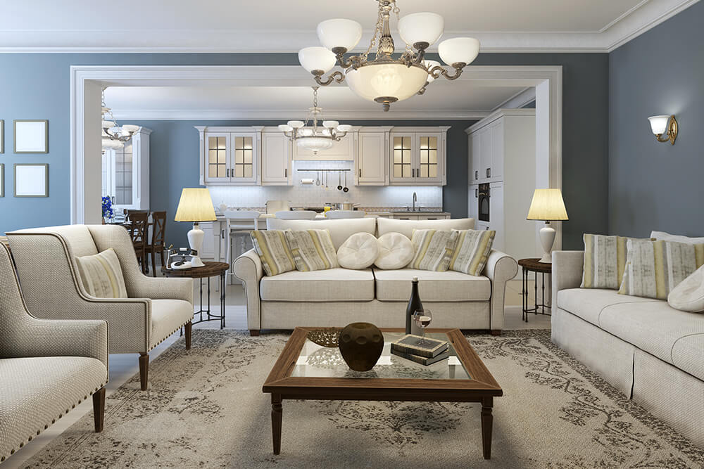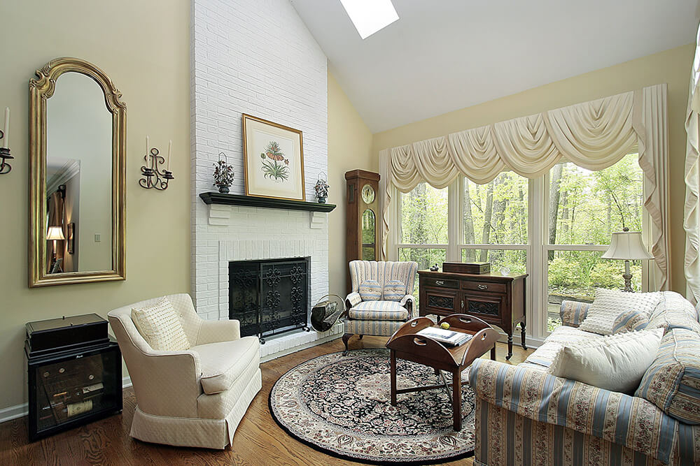 На полу чаще всего используется паркет, но его можно заменить и паркетной доской или ламинатом. Сверху покрытия нередко укладывают ковролин светлого цвета. Потолок будет смотреться максимально аутентично благодаря изысканной лепнине, его также можно украсить скульптурными бордюрчиками. В качестве покрытия для стен можно выбрать бумажные или атласные обои с мелким цветочным рисунком или тонкой полоской, акварельную роспись и обилие зеркал. В гостиной хорошо будет смотреться камин, обложенный камнем. Оконные проемы должны быть максимально большими, чтобы обеспечивать обилие естественного света. Двери устанавливаются в белом цвете, с большим количеством остекления.
