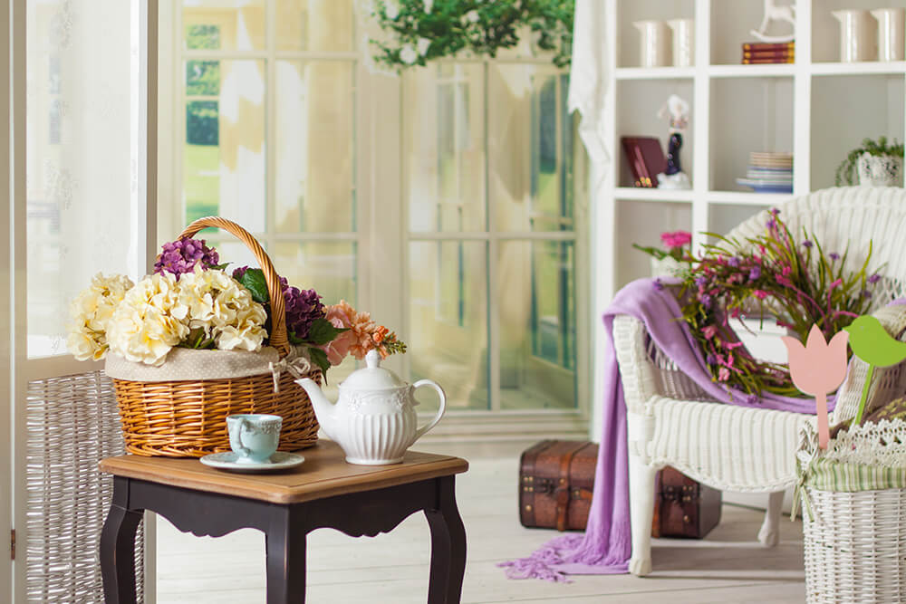 Окна украшают полупрозрачные занавески, которые умеренно пропускают солнечные лучи. Лучше всего, если они будут неяркого однотонного цвета, либо с нежным цветочным орнаментом. В качестве материала для пошива чаще всего используются батист, ситец или сатин. Гармоничную композицию с ними могут создать салфетки и скатерти с вышивкой, кружевами или мережками. На полочках и любых других горизонтальных поверхностях можно разместить семейные фотографии, красивые кованые подсвечники, горшки с цветами, например, лавандой или комнатными розами. Весьма органично в стиль прованса вписываются шкатулки, бутылочки и тарелки, оформленные в технике декупаж.