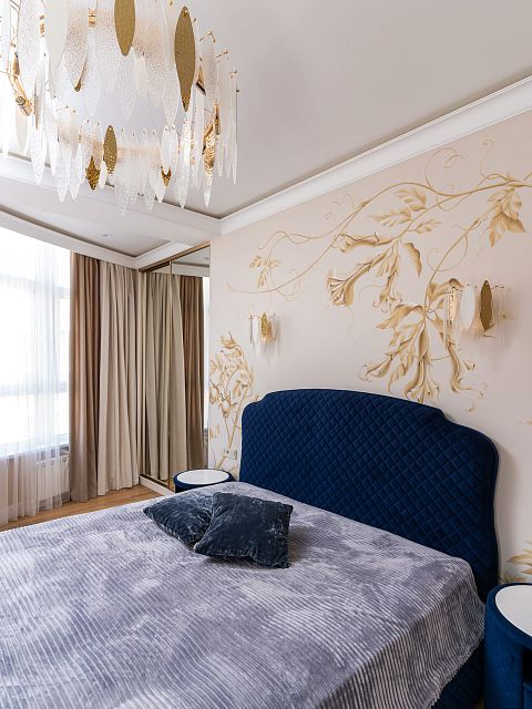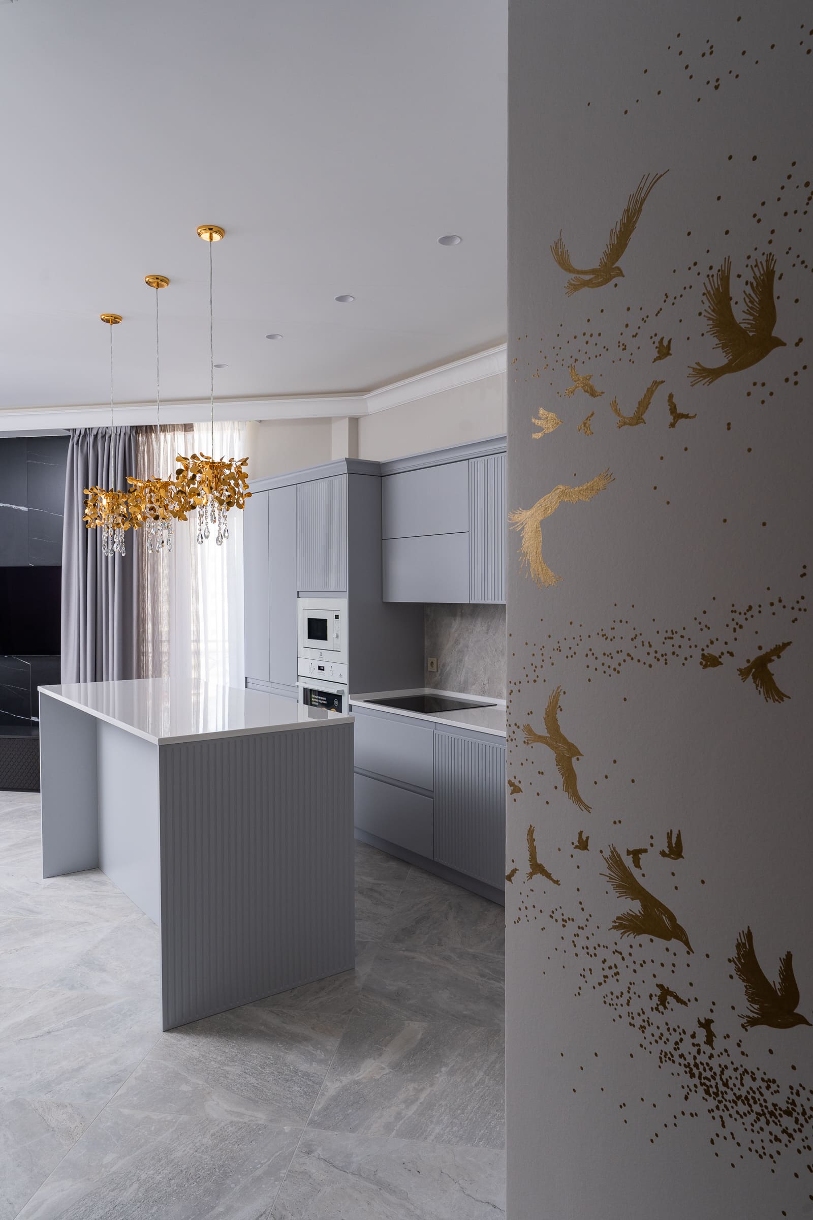 Остальные детали интерьера под стать: обои ручной работы с золотыми узорами, дизайнерские светильники и мебель.