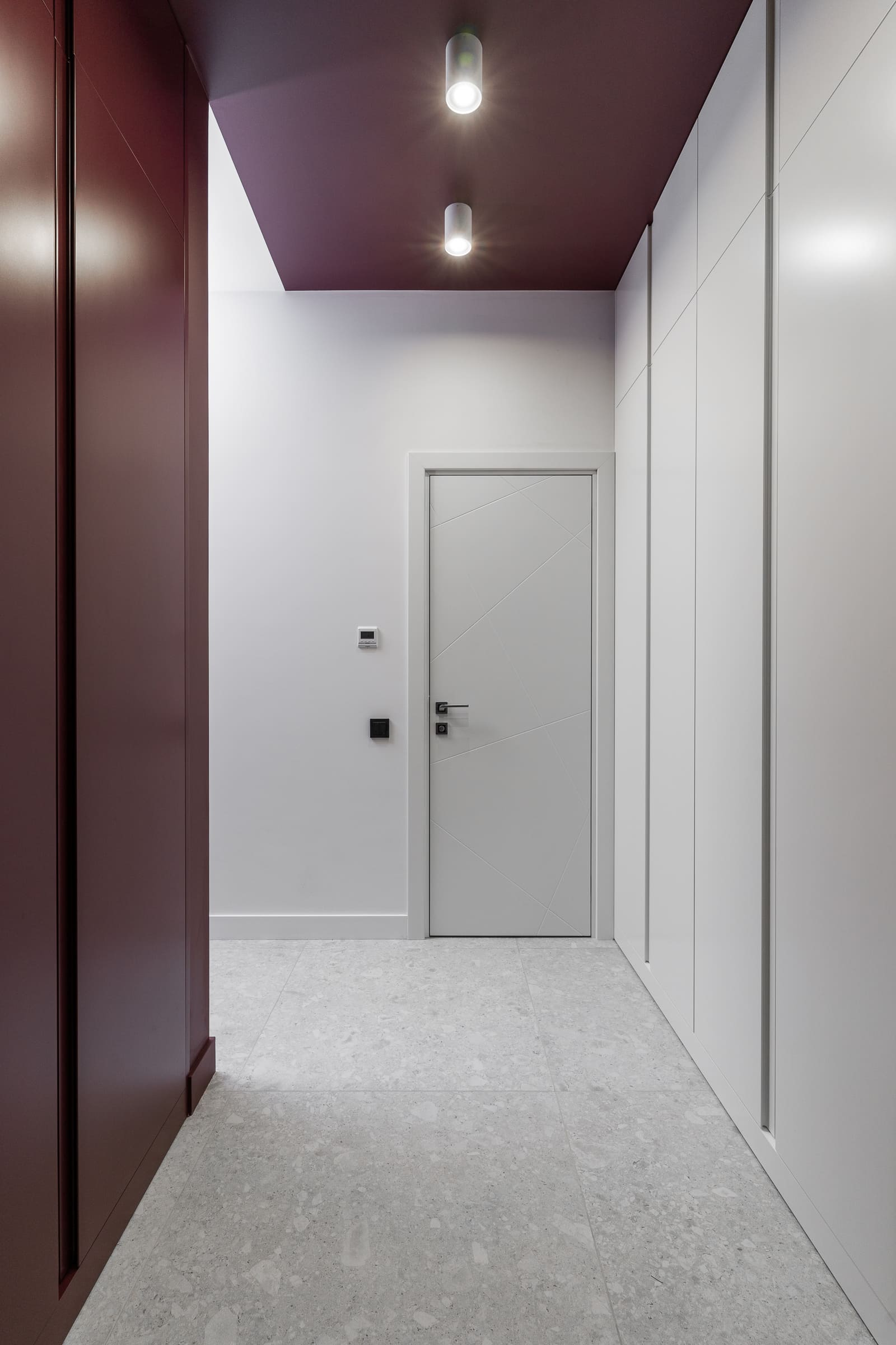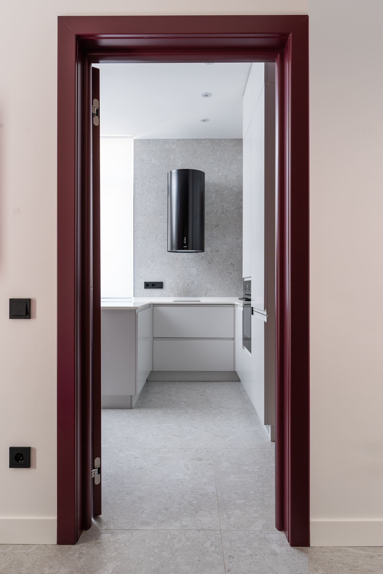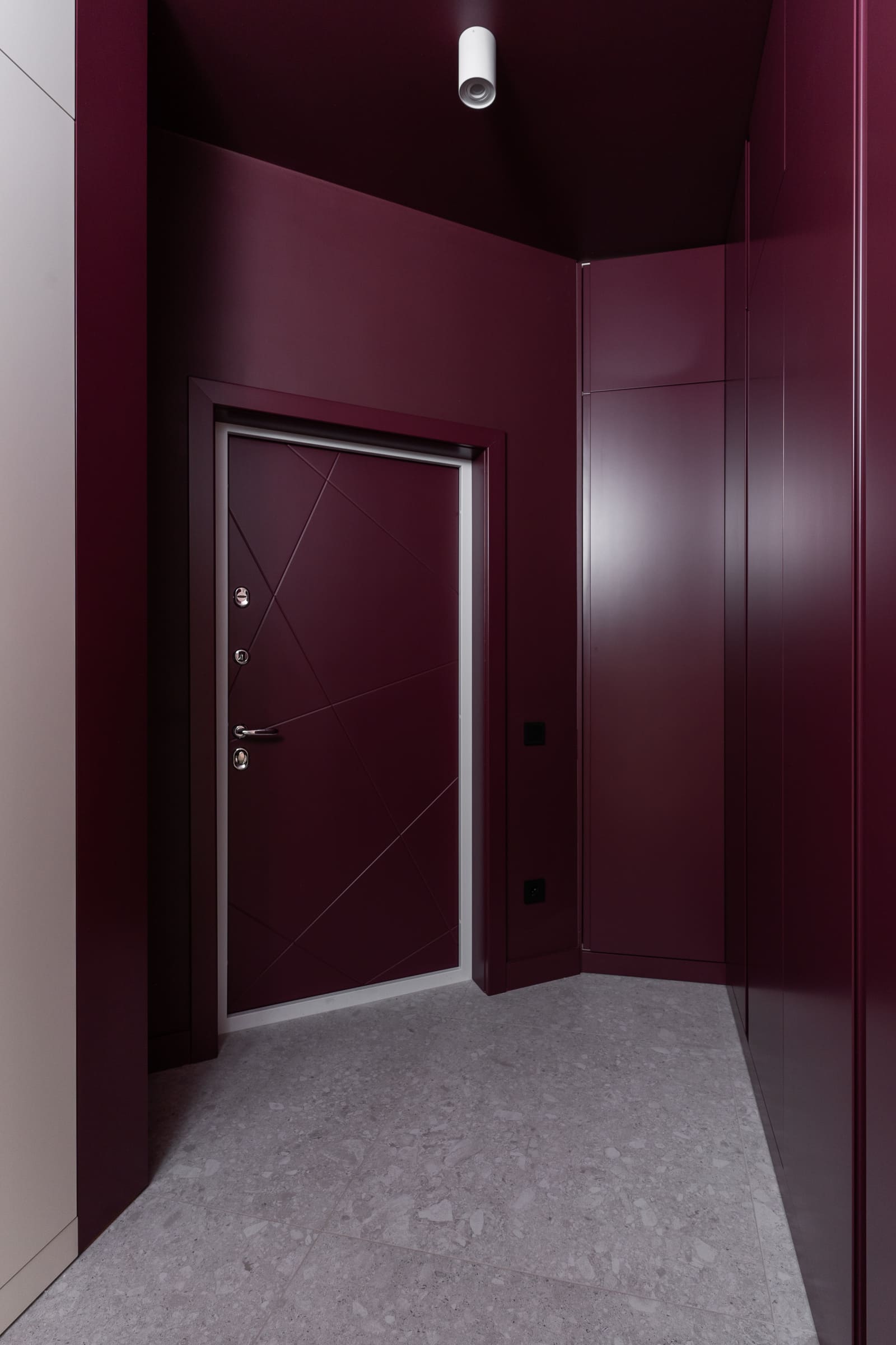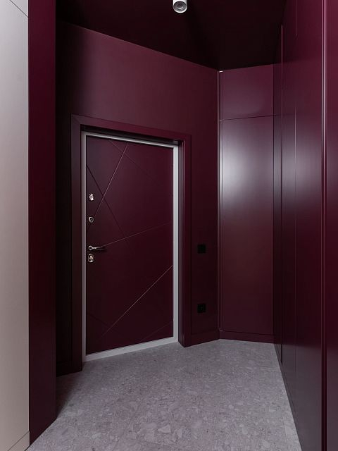 Для дверных проемов Софья выбрала модель Twist 01 в бордовом и белом цвете - в зависимости от цвета окружающих полотна стен. Получилась яркая и в то же время сдержанная композиция.