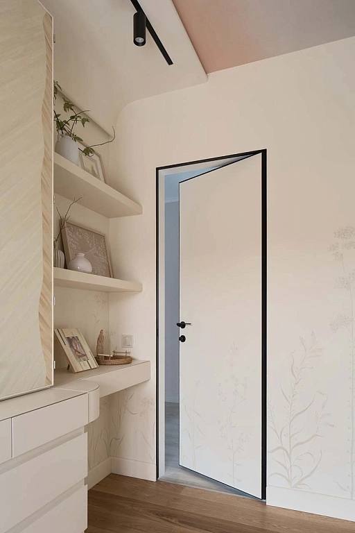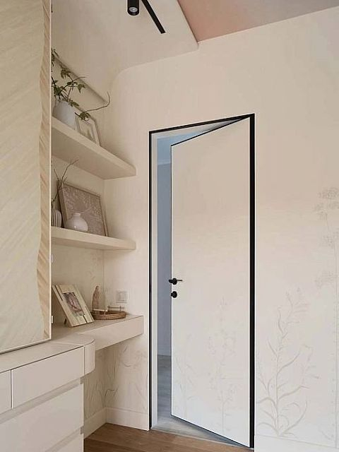 В создании уютного интерьера активно участвовала фабрика «Терем», установив двери модели Secret. Их система скрытого короба позволяет вписать полотна в единую плоскость со стеной без наличников, что придает интерьеру современный вид. Алюминиевая кромка защищает торцы дверей, а незаметные скрытые петли обеспечивают функциональность и эстетику.