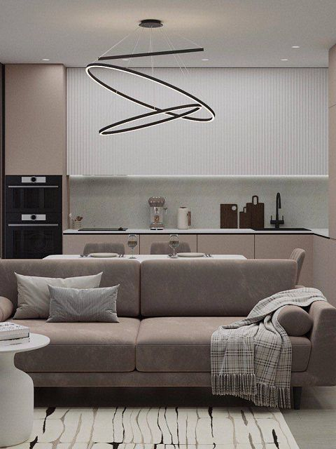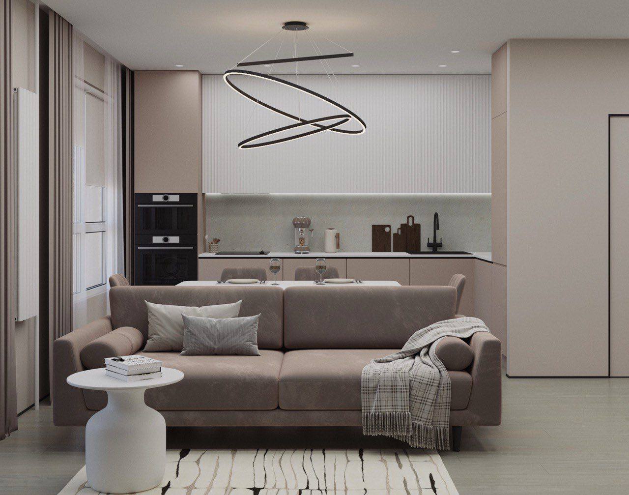 Пространство зонировано без лишних перегородок, что визуально расширяет площадь.
