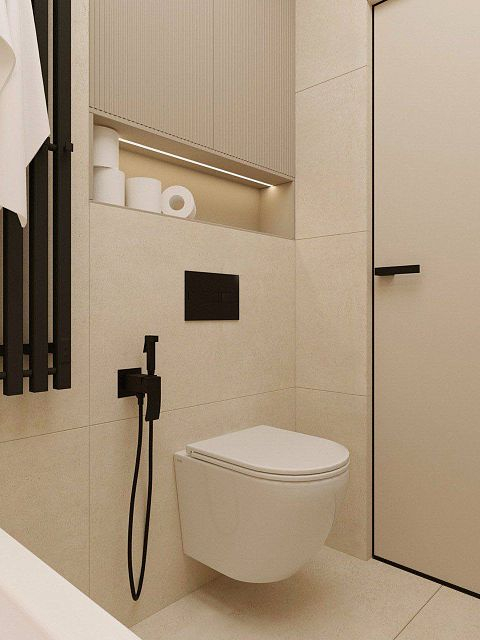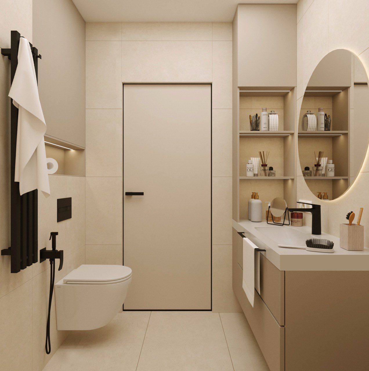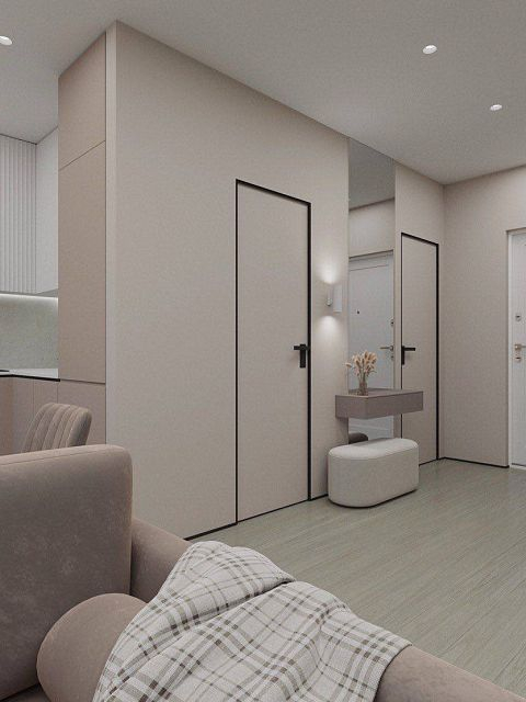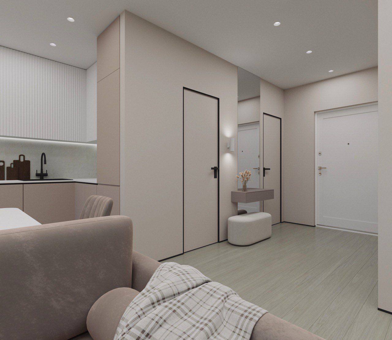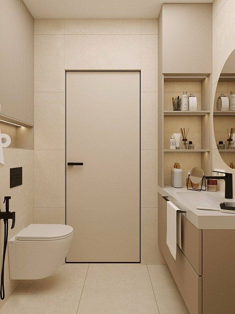 Ключевая особенность — двери скрытого монтажа, которые сливаются со стенами и не нарушают чистоту линий.