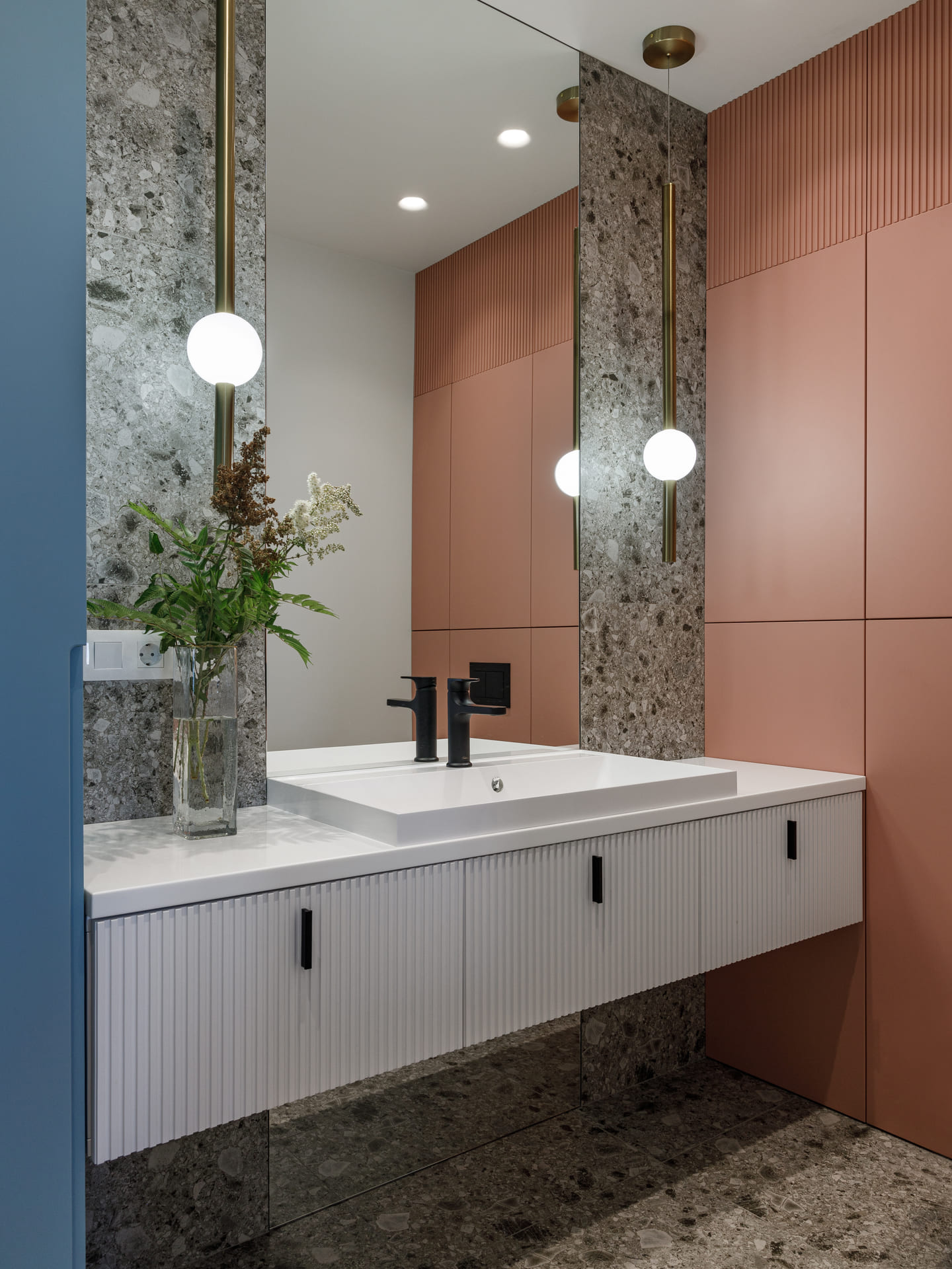 Интерьер квартиры светлый и в то же время насыщенный цветами, что создает ощущение свежести и воздушности. Использование ярких акцентов подчеркивает элегантность и добавляет индивидуальности пространству. Каждое помещение продумано таким образом, чтобы визуально расширить пространство, позволяя свету свободно плавать по комнате.