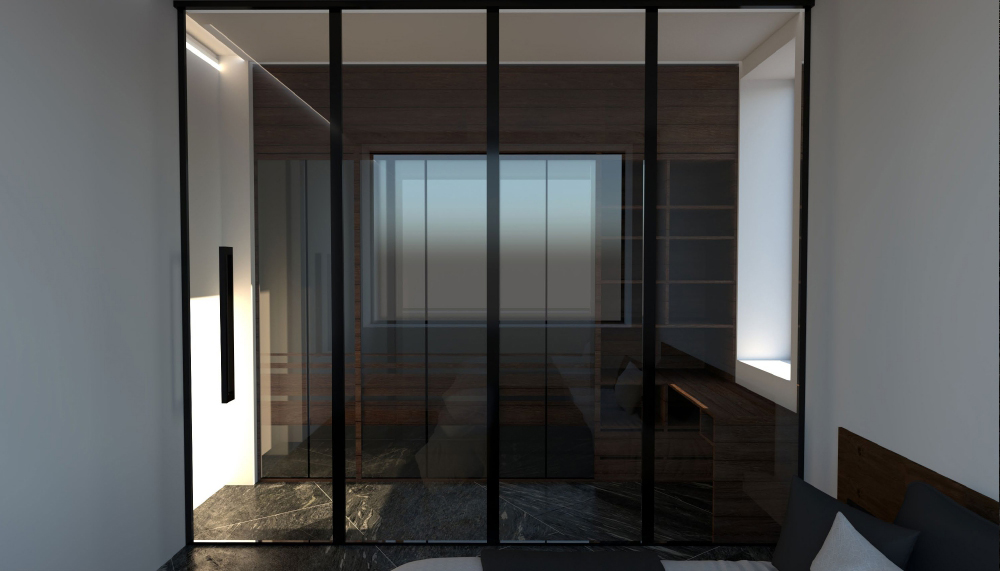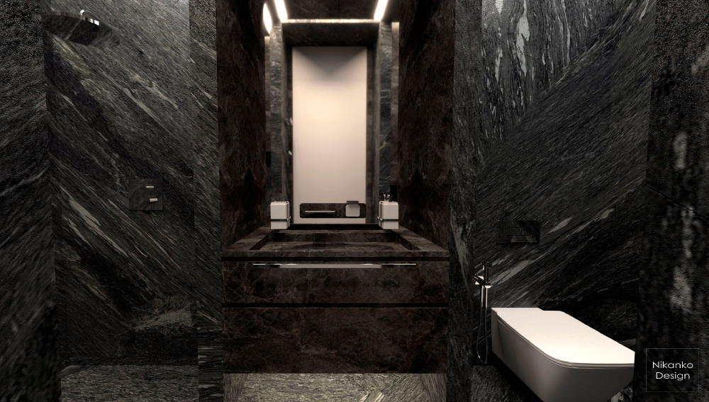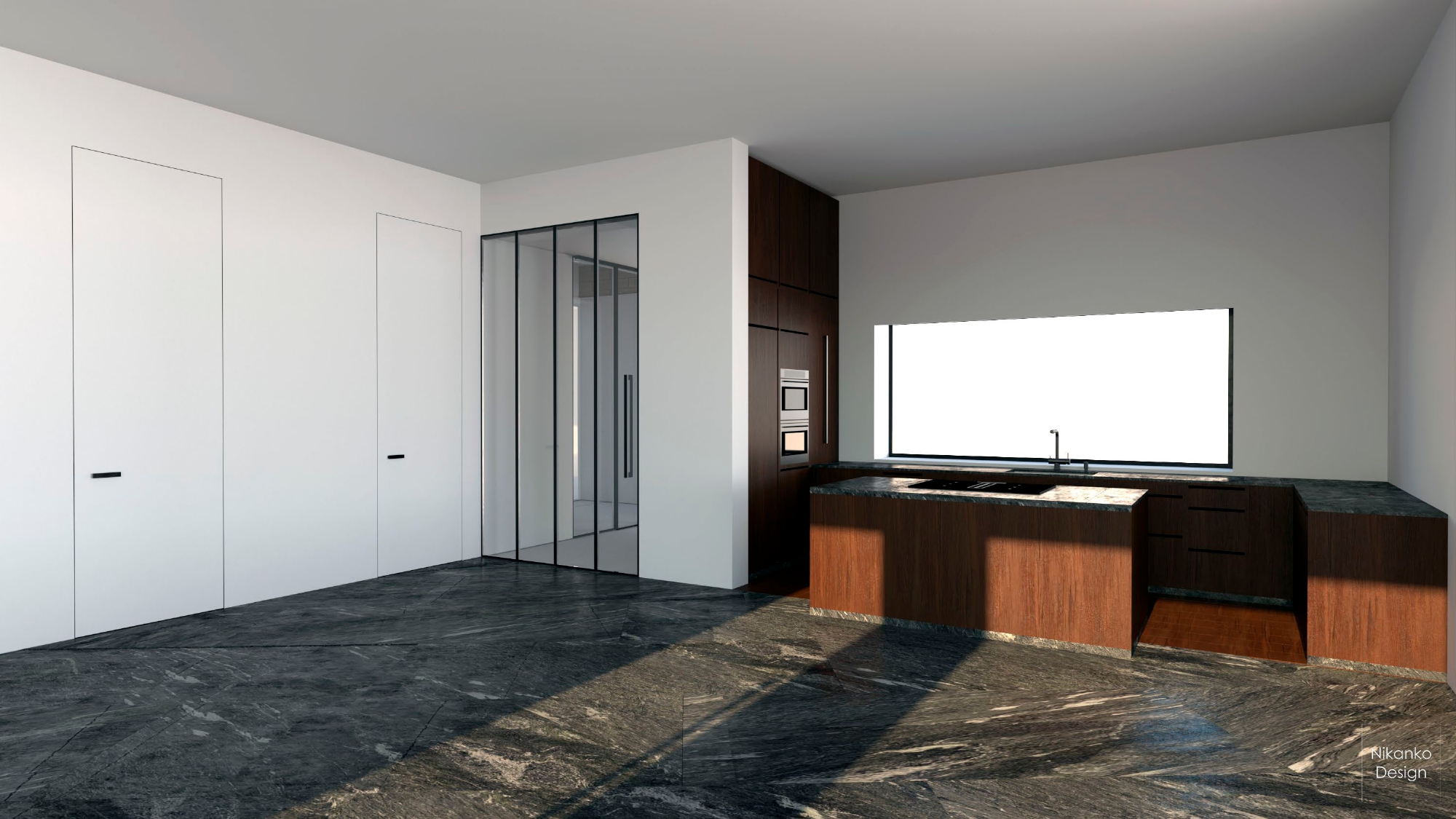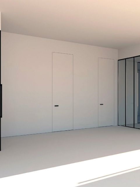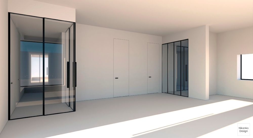Особое внимание уделено входной зоне: в проекте предусмотрена дверь скрытого монтажа, которая придает дому современный и минималистичный вид, создавая ощущение простора. Этот проект является идеальным примером современного дизайна, где каждая деталь продумана для комфортного и стильного образа жизни.