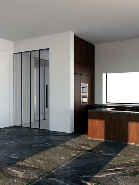 Отделка выполнена из натуральных материалов, придающих домовой среде естественность и теплоту. Дизайнерская мебель, специально подобранная для этого проекта, обрамляет комнату, создавая не только эстетическое, но и функциональное выражение стиля. Блоки мебели также спроектированы с учетом уникальных потребностей жителей, что делает их частью общего дизайна и максимально удобными.