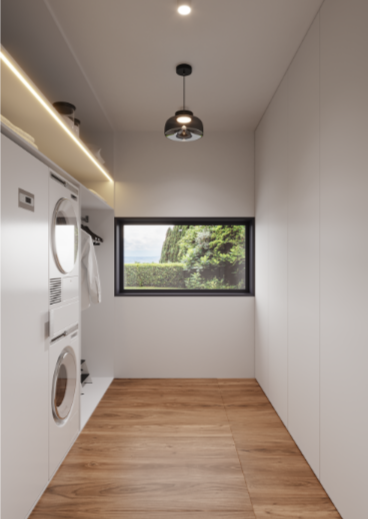 Особое внимание уделяется функциональности общих пространств: просторная кухня-гостиная с кухонным островом служит идеальным местом для семейного времяпрепровождения. Планировка включает несколько зон – гостевой санузел, постирочную и кладовую. Выход на террасу из гостиной создает дополнительное пространство для отдыха на свежем воздухе.
