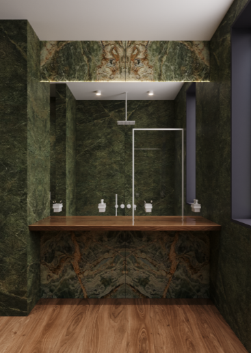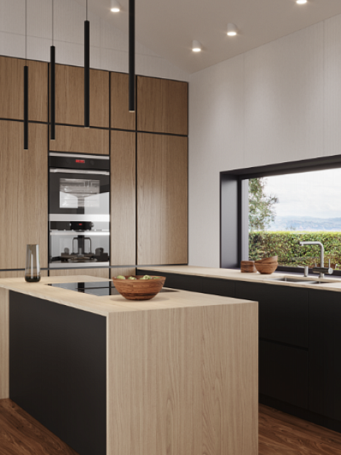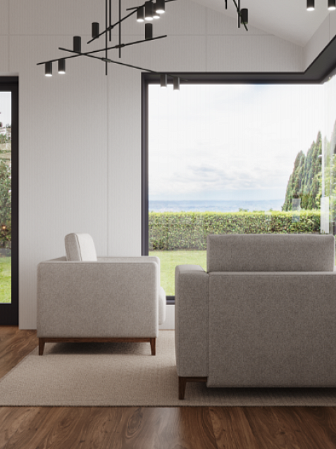 В дизайне использованы матовые и спокойные цвета, контрастные сочетания черного и белого. Натуральные оттенки и текстуры, а также деревянные и каменные фактуры создают тепло и уют. Панорамные окна наполняют пространство солнечным светом и открывают великолепные виды на окружающий пейзаж, а продуманная система освещения подчеркивает детали интерьера в любое время суток.
