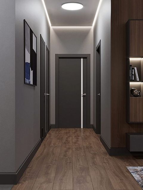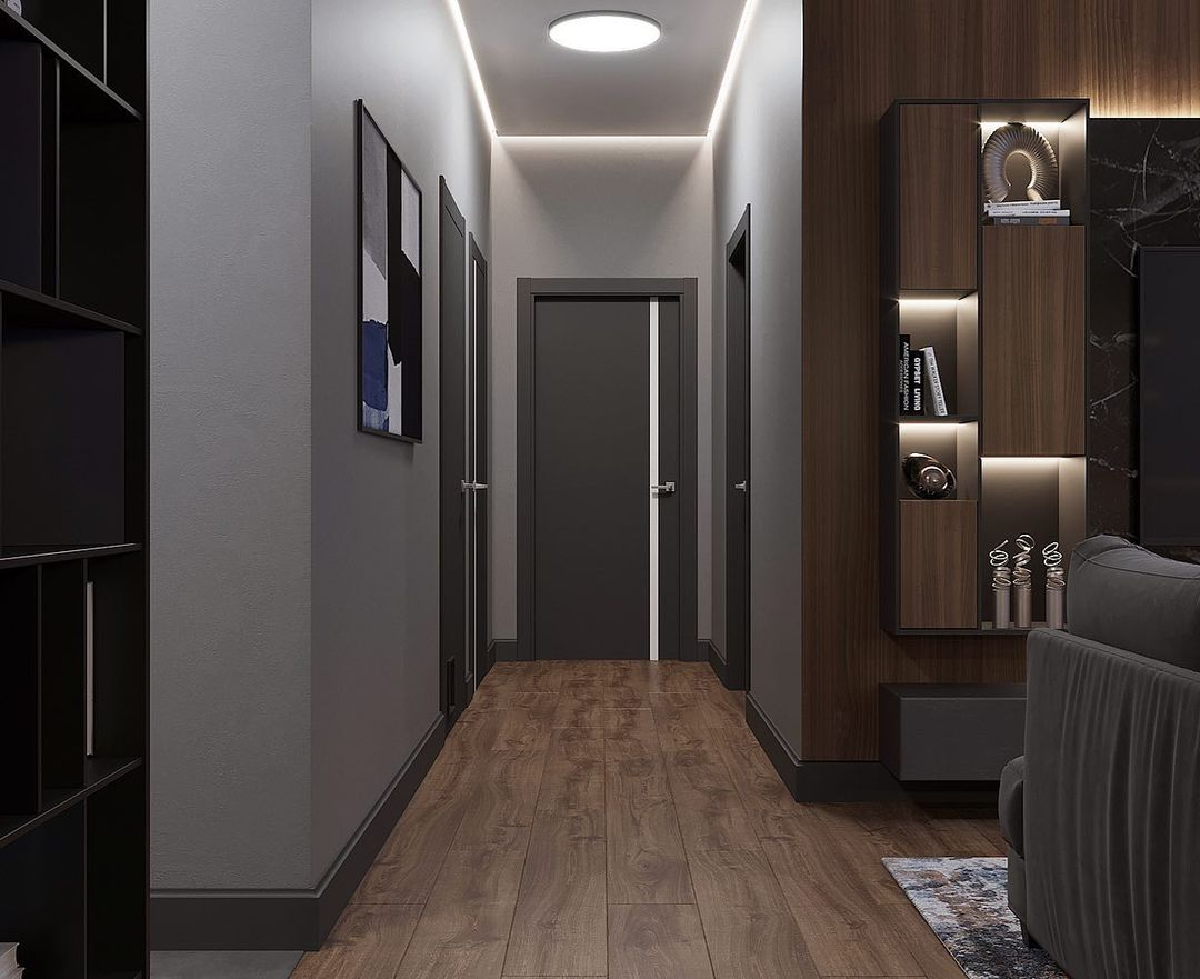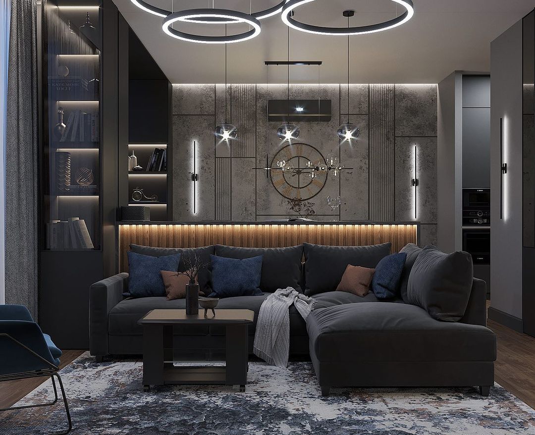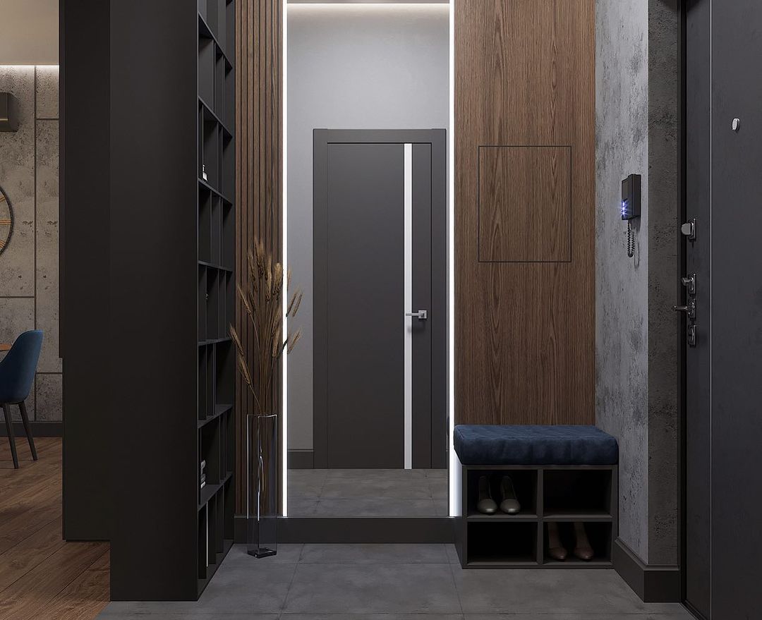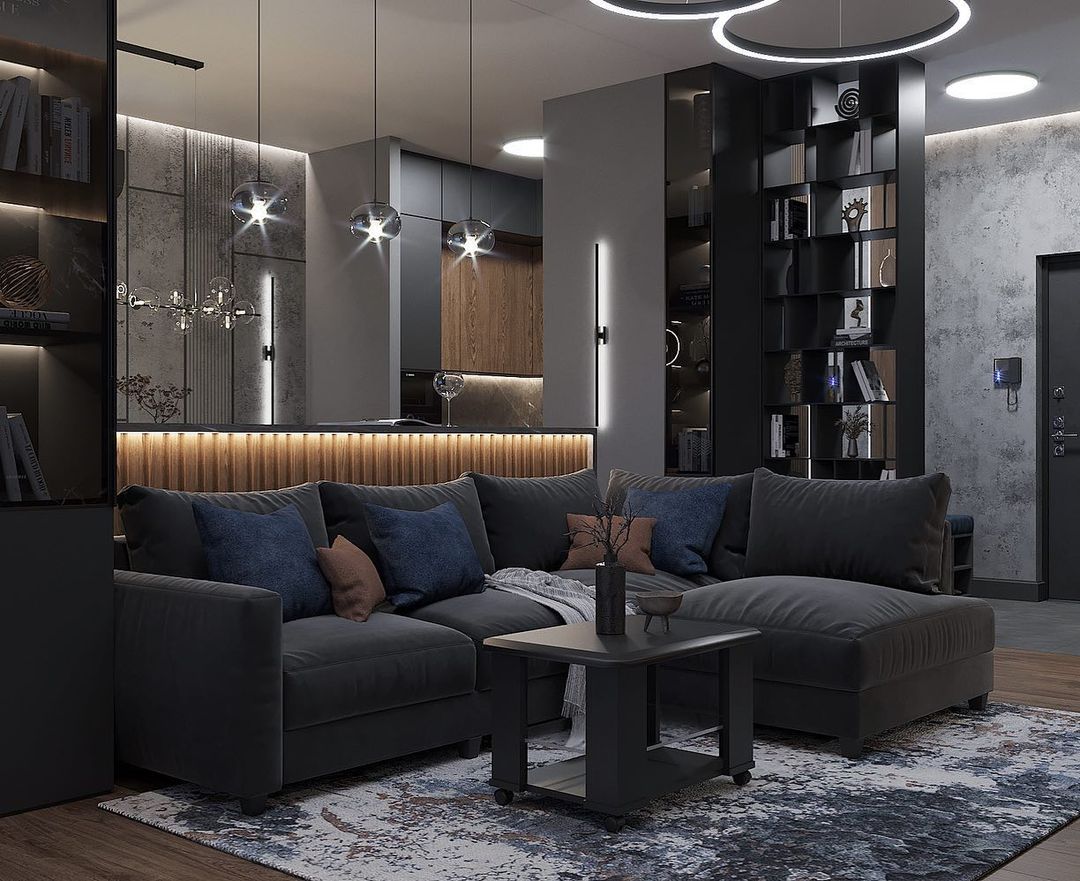 Вот такой дизайн-проект современной и стильной кухни-гостиной и прихожей получилось воссоздать для владельцев уютной квартиры в 45 кв.м.