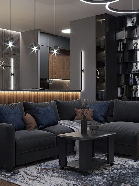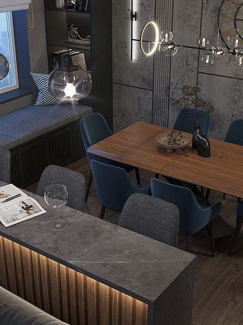Благодаря грамотной дизайнерской планировке в помещении удалось разместить большой диван с креслом и TV-зоной, барную стойку, большой обеденный стол и мягкую зону для отдыха у окна.