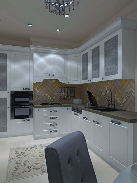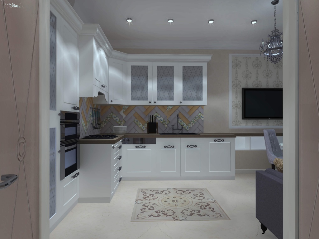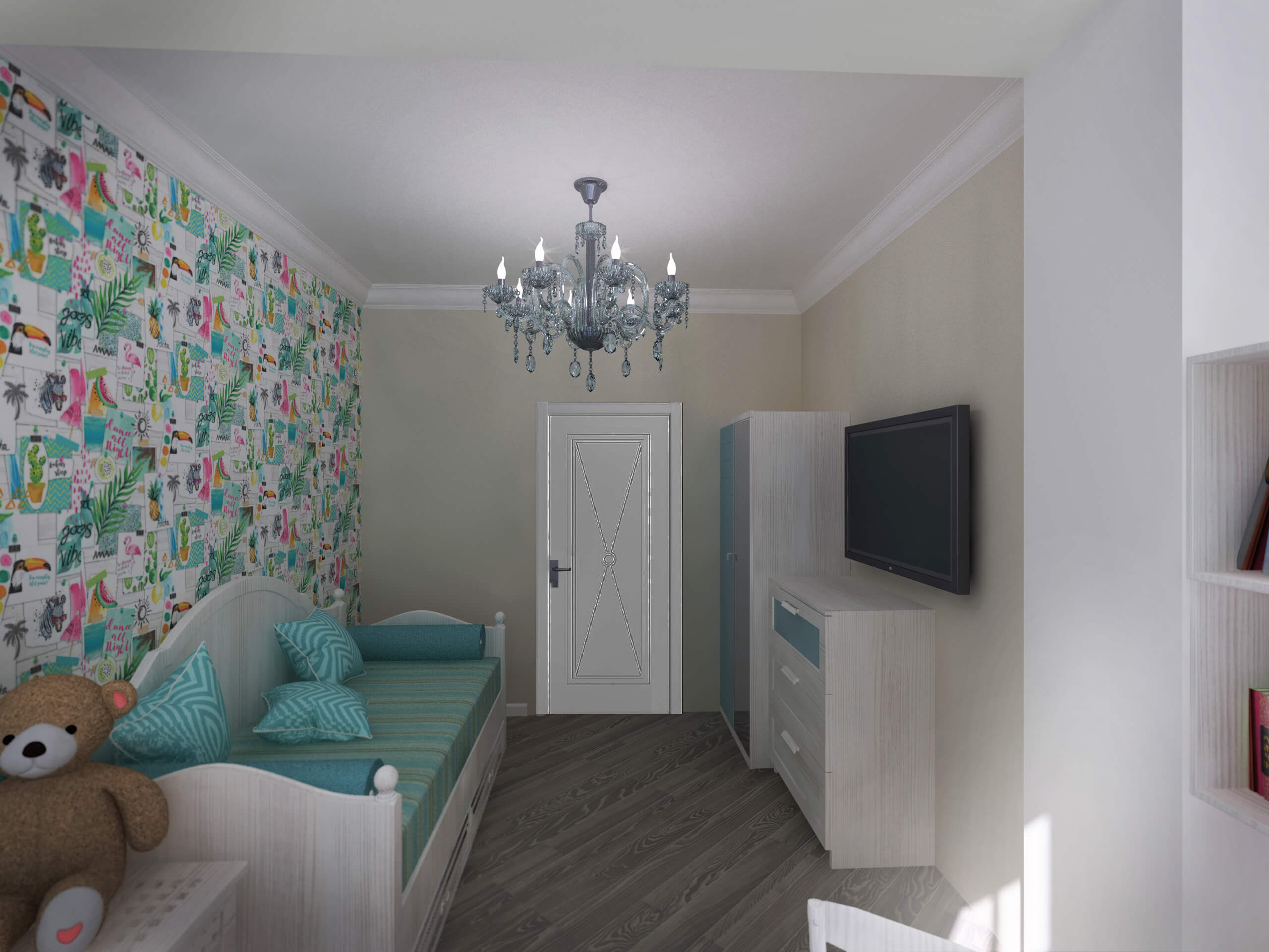 Целью было создать светлый интерьер в стиле «современная классика» с применением обоев на стенах, керамогранитом под мрамор сатуарио на полу в кухне и санузлах, ламинатом в комнатах, натяжными белыми матовыми потолками. Очень нарядной получилась кухня из белой немецкой плёнки с патиной а также сочетание рисунков обоев в столовой зоне. В детской комнате мы добавили цвета благодаря «веселым» обоям imaginarium, которые внесли нотку бирюзового цвета и ярких модных принтов в квартиру.
