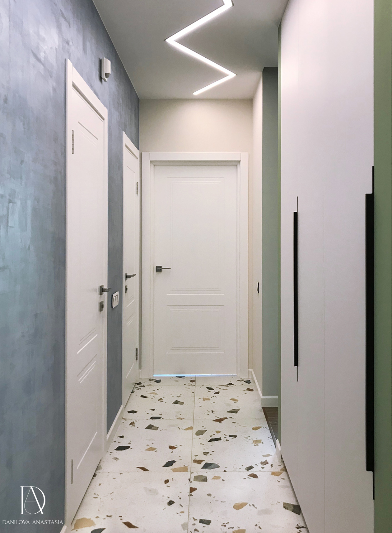 Также в проекте мы использовали скрытую дверь, чтобы сделать акцентную фреску в интерьере при входе и скрыть гардеробную комнату. Дверь взяли с алюминиевой кромкой, чтобы максимально плотно прийти к нему фреской и не задевать фреску во время эксплуатации. Со стороны гардеробной дверь покрасили.