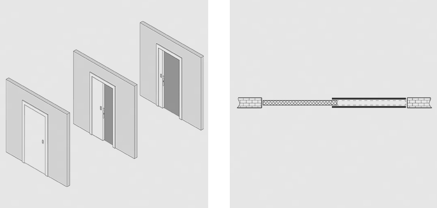 Для корректной работы системы в стене необходимо сделать специальный пенал, в который будет заходить дверное полотно. Пенал монтируется непосредственно в стену, зачастую с помощью гипсокартонной конструкции. Так получается, что дверь полностью скрыта в стене, а освободившееся пространство можно использовать по своему усмотрению. Можно заказать одно или два дверных полотна.